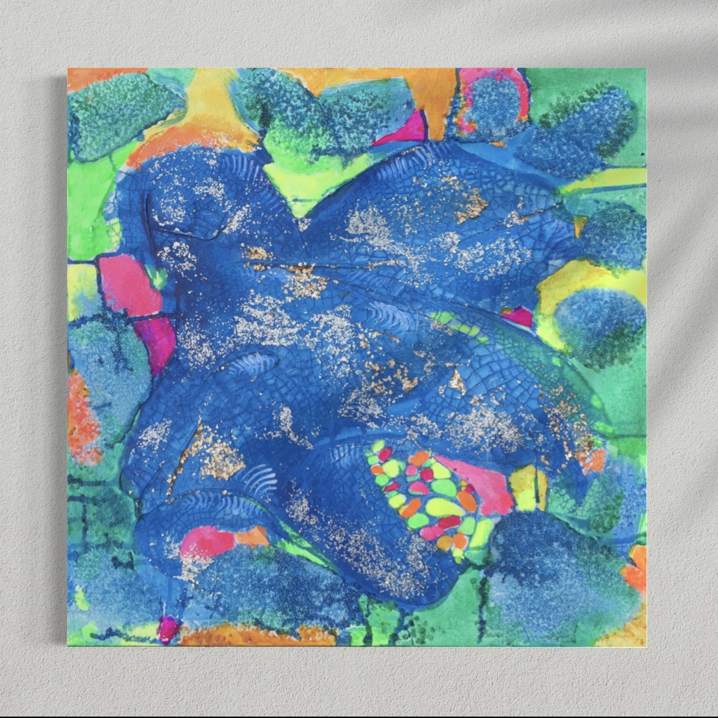The Mosaic Reflection paintings are inspired by stained glass windows and mosaics found in places of worship. The dominant color in this series is cobalt blue symbolizing both the sky and sea. Some of our favorite artists including Marc Chagall, Claude Monet, and Vincent Van Gogh are known for their use of cobalt blue in their paintings. It is a color that compliments every other color.